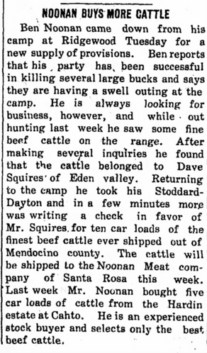 Ben Noonan was a local young man from a pioneer family in Santa Rosa. His family owned the slaughterhouse at today's corner of W. College and Dutton Ave. Noonan Meat Company had an entitlement from Santa Rosa to herd cattle down College Avenue from the Southern Pacific stockyard on North Street as well as pasture land and feedlots bordering the more populated areas of the City of Santa Rosa. In its heyday, Noonan Meat Company supplied meat to businesses from San Rafael to Fort Bragg. Patrick Noonan married a Talmadge, another pioneer family from Mendocino County.