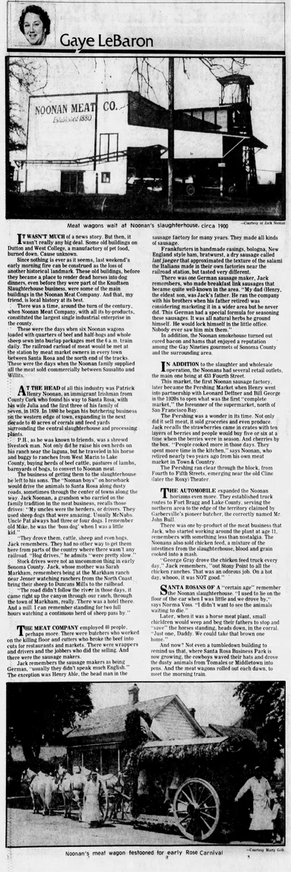 “PATRICK H. NOONAN, the proprietor of the stockyards and slaughtering house of Santa Rosa, was born in Cork, Ireland, January 14, 1845, the son of Patrick and Ellen (Sullivan) Noonan, both natives of the same place. His father being a farmer the younger Patrick was reared to this life, and though he has since de parted from it the training which he received in his childhood home has proved invaluable in his efforts on American soil. The children born to his parents, who are now living, are as fol lows: Margaret, now Mrs. McLaughlin, of Springfield, Mass.; Jeremiah, located in Nevada county, Cal., whither he immigrated in 1859, coming by way of the Isthmus of Panama, and at once engaged in mining; and Patrick H., of this IÅ¿e V16W. When five years old, in 1850, Patrick H. Noonan came to America with his mother, brother and sister, and after a thirty days voyage, landed at Castle Garden, New York. For some time the entire family remained in the east, located in Massachusetts, where Patrick H. learned the paper-making trade, and during the five years thus engaged he was promoted to a foremanship. His brother, however, having been attracted to the west by the glowing pictures of the wealth contained among the rugged hills of that region, he felt constrained to venture into the same locality. April 15, 1865, therefore, he took passage on board a vessel bound for Central America, the trip being made memorable by the painful news of President Lincoln's assassination, which reached them between New York and their destination. Upon landing in San Francisco in the same year Mr. Noonan followed his brother to Nevada county, remaining there for only one year, at the close of that period bending his steps northward to Idaho, where he met with success in his combined interests of mining for three years and the butcher business for eleven. In 1870 he returned to Massachusetts, where he was united in marriage with Miss Julia McCauliff, a native of that state, and together they came to California the following April and from here journeyed to Boise City, Idaho, where Mr. Noonan continued his business until 1878, at that time disposing of the same and removing to Minnesota. The intense cold of this latter state was the means of driving them back to the west after six months, and in the spring of 1879, they settled in the City of Roses, the beautiful title of the little city of Santa Rosa, Sonoma county, Cal. In 1880 Mr. Noonan engaged again in the butcher business in this new location and has since built up a very lucrative and successful patronage. In 1886 he purchased the forty acres which he now owns adjacent to the city, two acres being occupied by his stockyard and slaughtering house, and eleven acres devoted to a feeding yard. He has also five hundred acres which he uses for pasture land, located in Santa Rosa township. Mr. Noonan handles from one hundred and eighty to two hundred head of cattle each month, furnishing the entire amount of meat consumed in the city of Santa Rosa, a part of which he disposes of as a retailer from his meat market located at 423 Fourth street, Santa Rosa. Mr. and Mrs. Noonan became the parents of eight children, seven of whom are now living. Henry D. was born October 19, 1873; William C., April 12, 1875; Patrick L., May 4, 1877; Benjamin S., February 12, 1880; Mary E., May 4, 1882; Francis A. died July 4, 1899; Margaret G. was born January 8, 1886; and Leo E., September 22, 1890. Mr. Noonan's sons ably assist him in the management of his ever-growing business. Fraternally he is a member of the Elks, and politically he casts his ballot with the Democratic party."